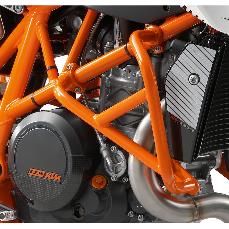 Kunststoffbeschichtete Stahl-Rohrbügel mit stabiler Befestigung am Rahmen schützen den Tank bei kleinen Stürzen und Umfallern.